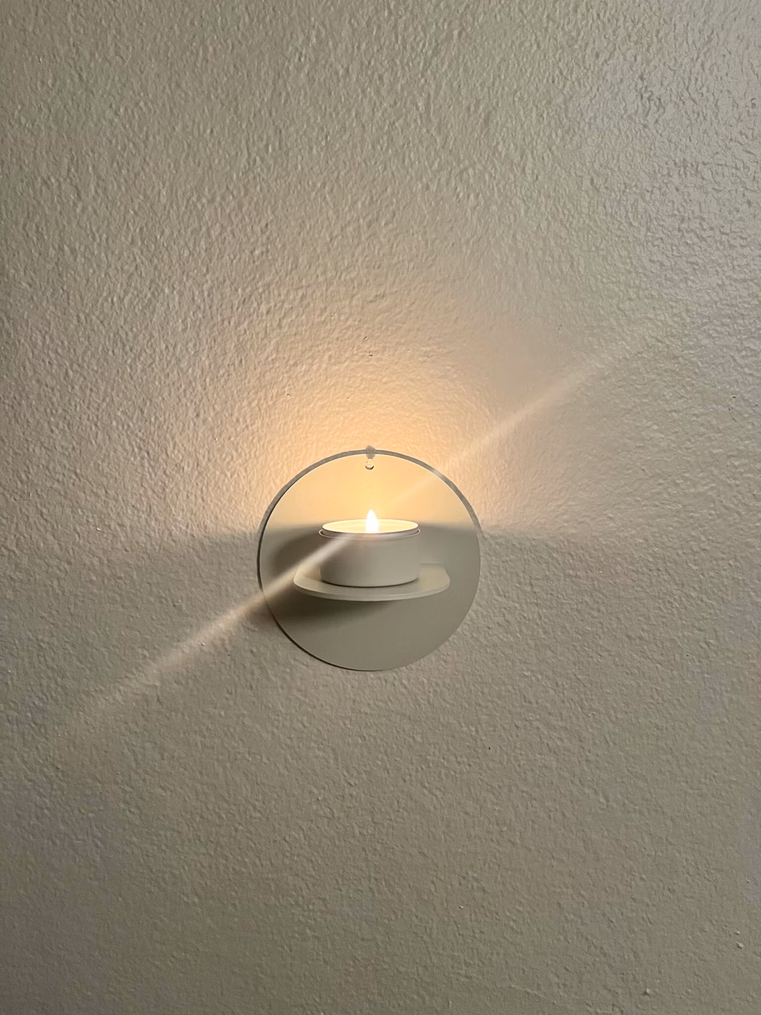 Denna vackra ljushållare är speciellt utformad för att pryda din vägg och ge ett mjukt och inbjudande sken till rummet. Den diskreta koppen är perfekt anpassad för värmeljus, vilket gör det enkelt att byta ut och tända nya ljus när stunden kräver det.